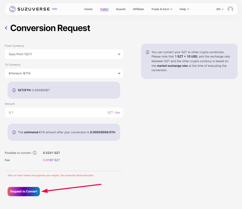 | Conversion fee (SZT -> ETH) for each request made: 0.7% |