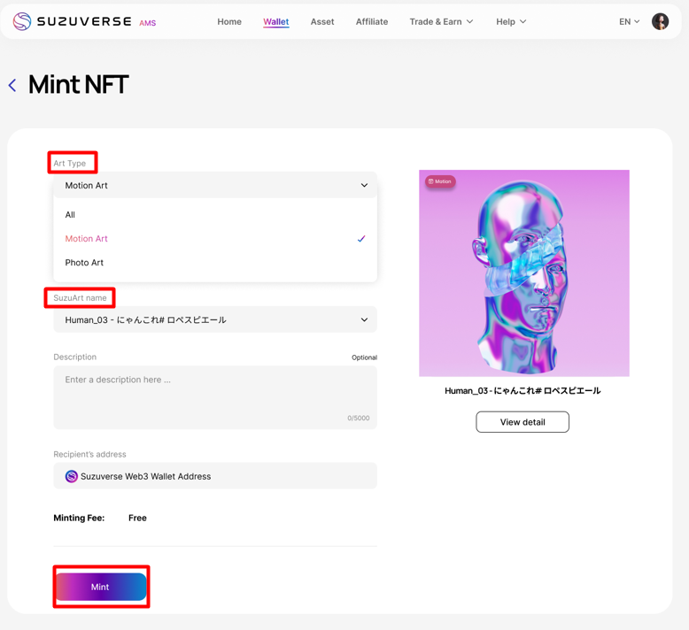3. Select Art type (Motion Art or Photo Art) and choose SuzuArt, fill in the describe if need
