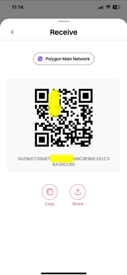 2. Tap to Receive, your wallet address displays and share it to your sender to receive NFT