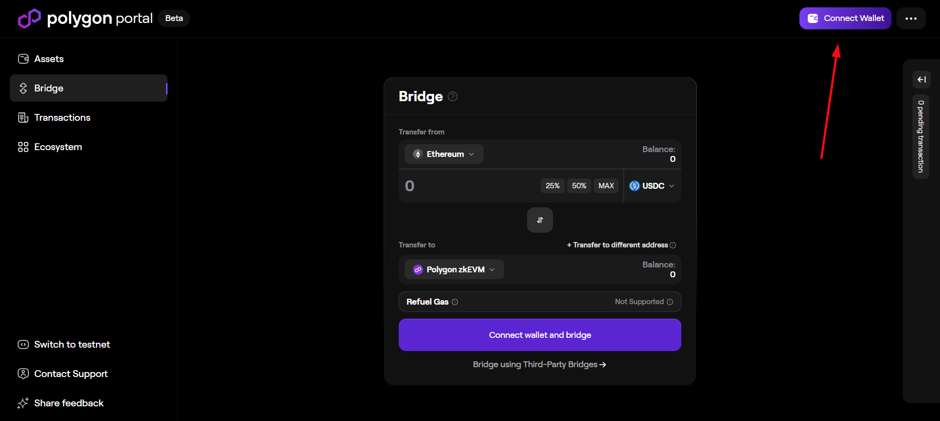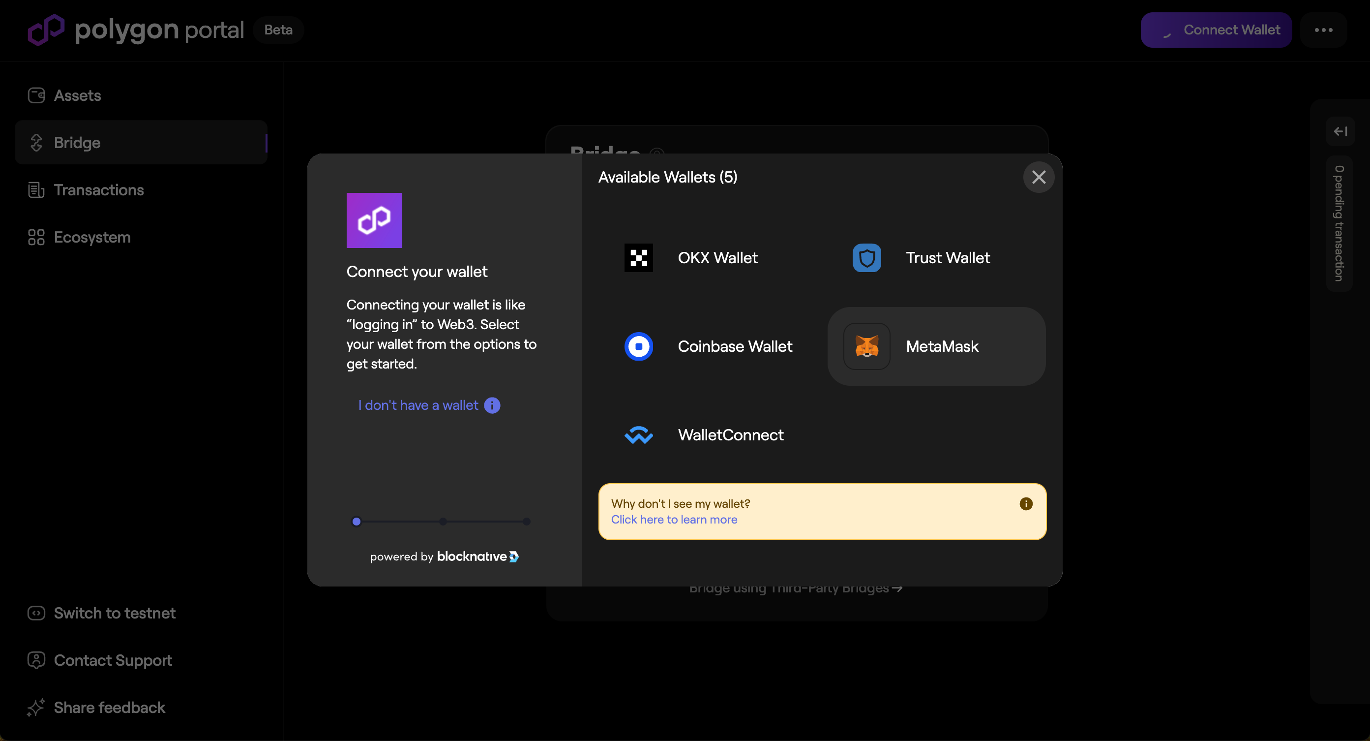 *Currently, Polygon Portal only support the wallets listed in the screen above. If you use a wallet which doesn't show here, you can import that wallet to METAMASK. You can follow this instruction.