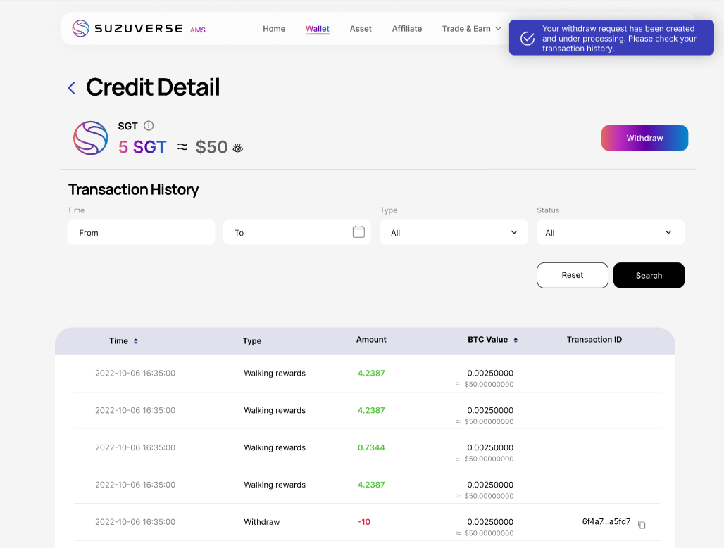 1. Access AMS page -> Wallet -> Suzu credit -> Click SGT