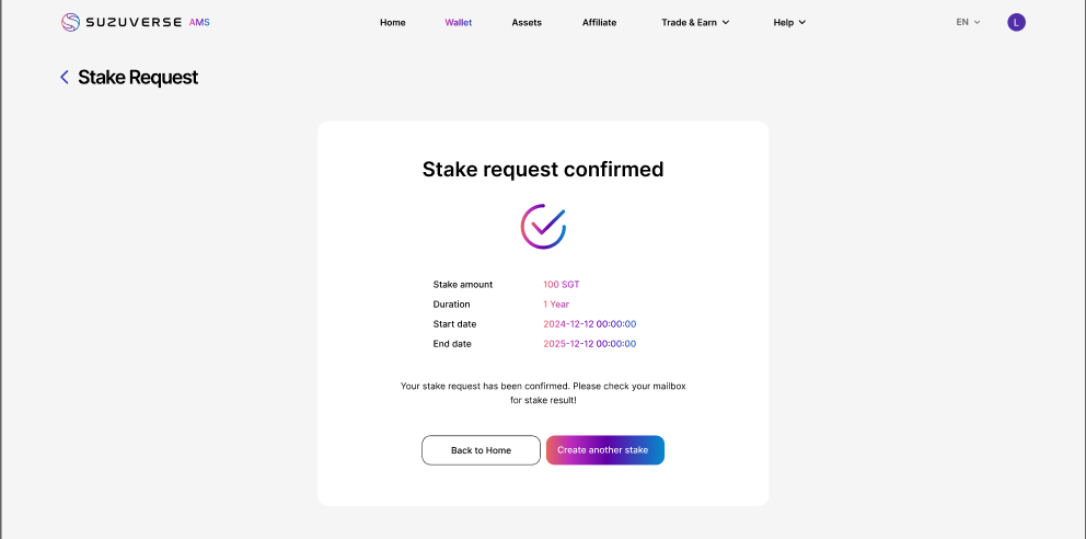 After confirming your request, a completion screen will appear, indicating that your staking is successful.