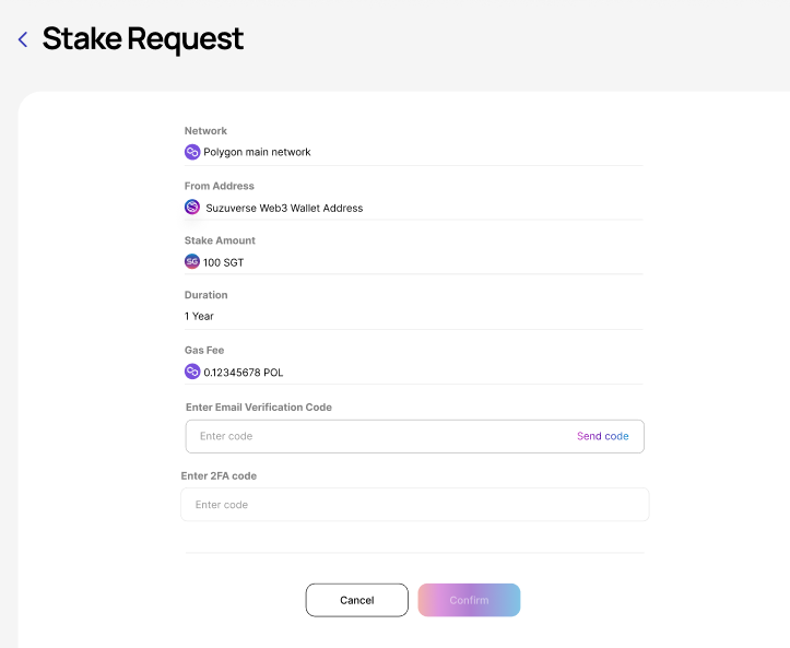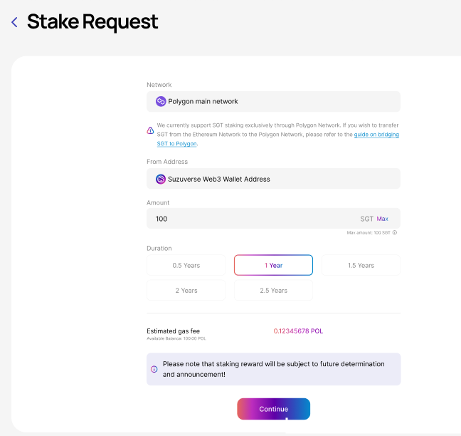 Important Notes: Staking is supported exclusively on the Polygon network. Please ensure your SGT is on the Polygon network before attempting to stake.