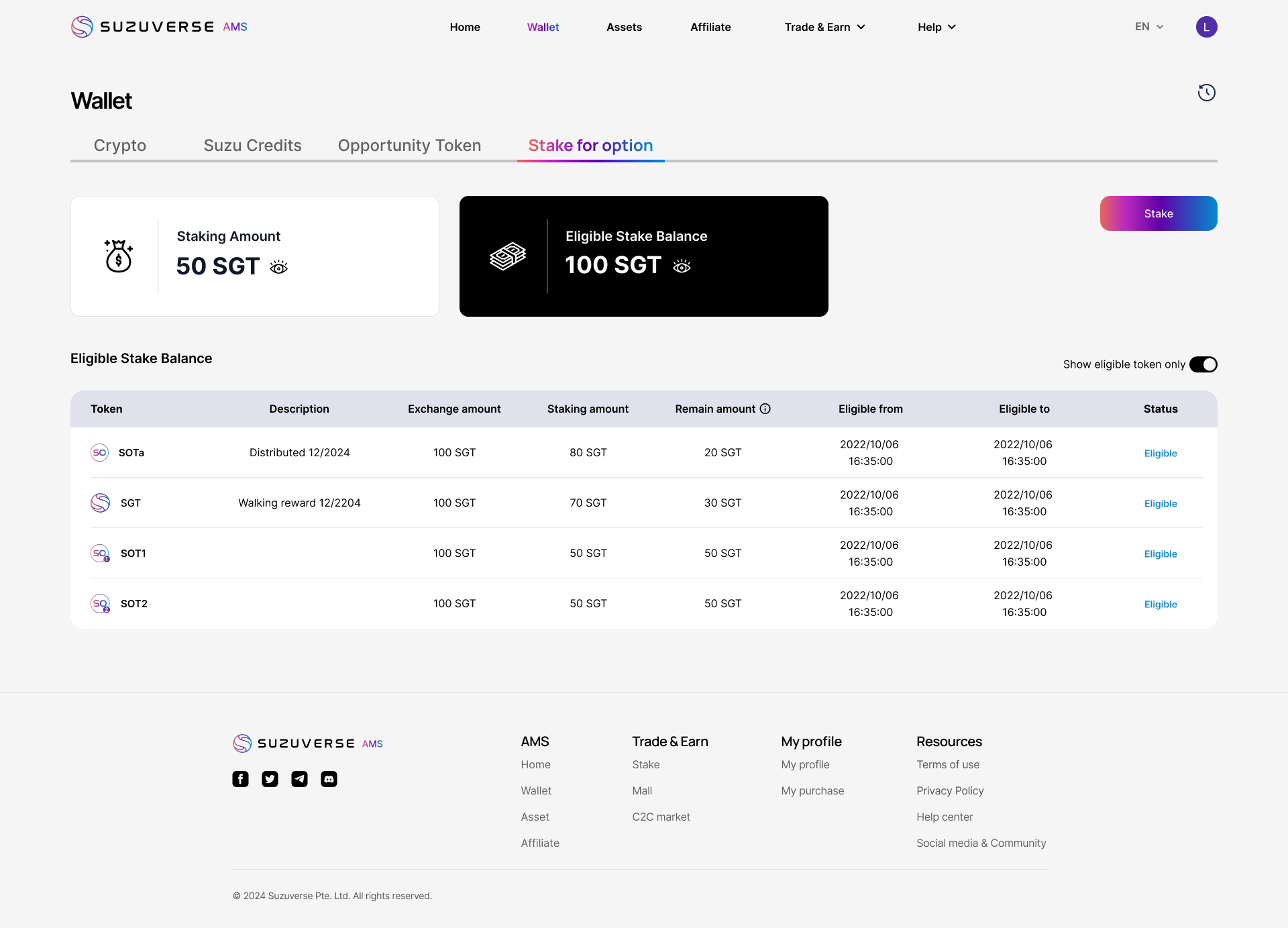 - Eligible Amount (SGT allowed to stake based on your exercised SOT limit)