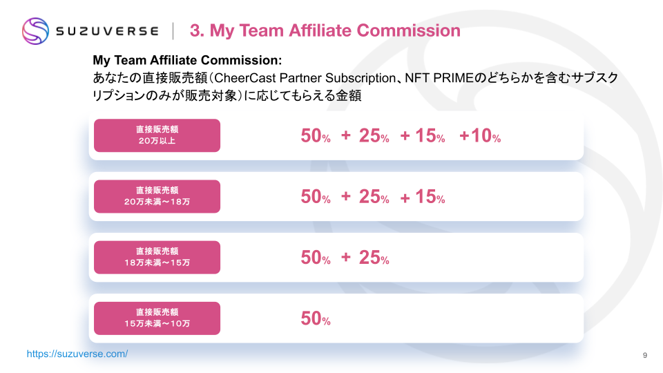 アフィリエイターは、個人の直接販売額(CheerCast Partner Subscription、NFT PRIMEのどちらかを含むサブスクリプションのみが販売対象となります。)が18万円以上の条件を満たした場合、レベル1のマイチームメンバーのアフィリエイトコミッションの50%、レベル2のマイチームメンバーのアフィリエイトコミッションの25%のコミッション、レベル3のマイチームメンバーのアフィリエイトコミッションの15%のコミッションを受け取れる。