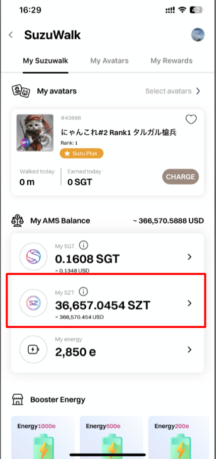 SZTの履歴を確認するには? Amanda 2024年10月07日 09:31 更新 1.Suzuverseアプリにアクセス -> メニュー -> Suzuwalkにアクセス: 2. SZTの金額をクリックしてください(マイSZTページ): 3. ここでSZTの履歴を見ることができる: 関連記事 散歩で獲得したSGTの出金方法 NFTのミント手順 SOTをWeb3ウォレットで取得するにはどうすればよいですか? お散歩履歴の確認方法は? SGTのステーキング方法