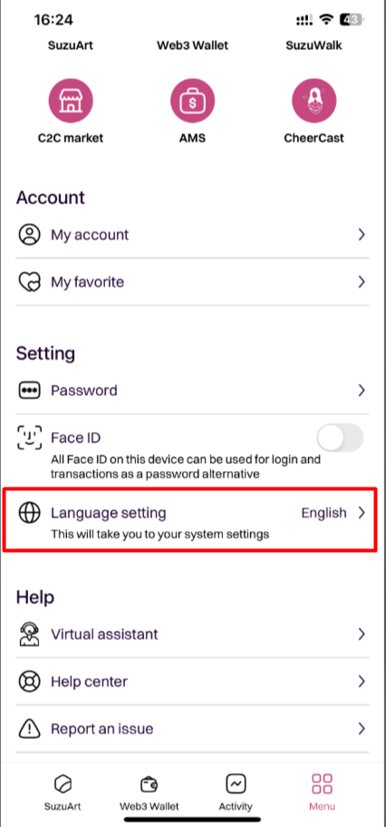 SUZUVERSEアプリの言語を変更するにはどうすればよいですか? Amanda 2024年10月07日 09:25 更新 1. アクセスSuzuverseアプリ - >メニュー: 2. 言語: 3. 「言語」をクリックし、必要な言語を選択します。 4. Suzuverse アプリに戻ると調整が表示されます。 関連記事 プロフィールの変更方法は? SZTの履歴を確認するには? Web3ウォレットへのアクセス方法 SUZUVERSEのアフィリエイトとは? ワンコの散歩方法