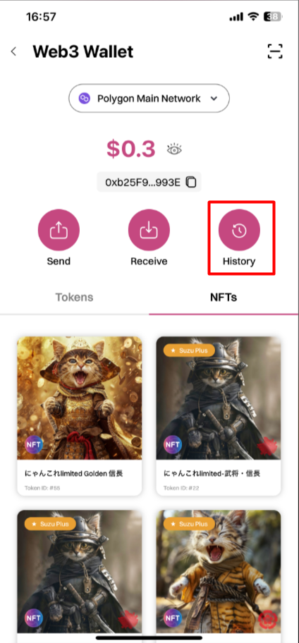NFT取引履歴の確認方法 Amanda 2024年09月20日 08:55 更新 1. Suzuverseアプリを開く -> メニュー -> Web3 Wallet 2. 履歴をタップ 3. NFTs タブを選択します。ここで全てのNFT取引履歴が表示されます。 4. 取引をクリックすると詳細が表示されます。 関連記事 NFT情報を確認するには? すべてのNFTはどこで確認できますか? SUZUVERSE NFT マーケットプレイスで NFT を販売するにはどうすればよいですか? NFTの送付方法は? 他人からNFTを受け取るには?