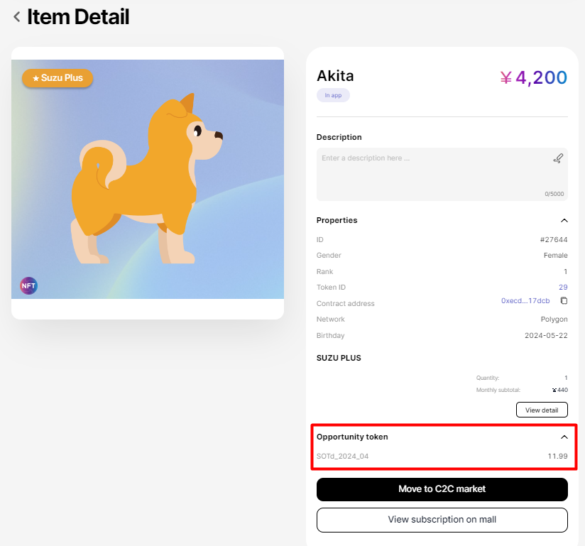 - アバターがNFTマーケットプレイスに出品されていない場合は、「アプリ内」タグが表示されます。NFTを販売するには、こちらの記事をご参照ください: SUZVERSE NFT MarketplaceでNFTを販売するには?