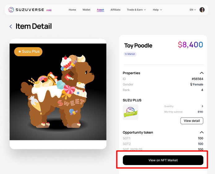 2. NFT をクリックします。アバターがリストされているとき、NFT には「In market」タグが表示されます。また、「NFT マーケットで表示」をクリックして詳細を確認し、NFT マーケットプレイスにリダイレクトして詳細を確認できます。