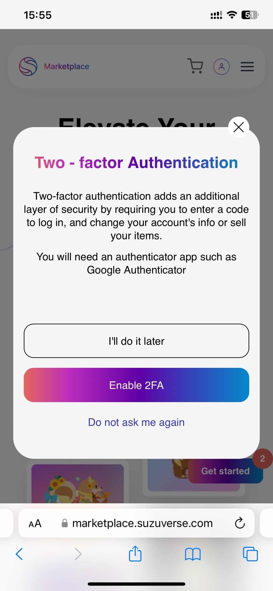 4. アカウントの有効化後、セキュリティ向上のために2ファクタ認証を選択することができます。これは、ログインを確認するためにGoogle認証アプリを必要とする追加機能です。これはオプションです。