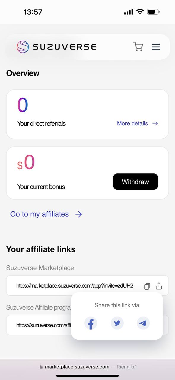 4. 어필리에이트 링크를 공유하세요: 스즈워크 애플리케이션과 스즈버스 마켓플레이스에서는 클릭 한 번으로 페이스북, 텔레그램, 트위터 등의 소셜 미디어 플랫폼에 링크를 쉽게 공유할 수 있는 편리한 기능을 구현했습니다. 이 기능은 링크를 공유하고 더 많은 사람들에게 콘텐츠를 홍보하는 과정을 간소화하기 위한 것입니다. 이 기능을 활용하여 어필리에이트 링크의 가시성과 영향력을 극대화하시기 바랍니다.