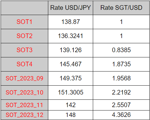 최근에 우리는 수익을 창출하는 일부 제휴사에게 SOT4를 배포했습니다. SOT4를 계산하려면: SOT4= 2023년 6월~9월의 수수료/(배포 당시 USD/JPY 환율)/(배포 당시 SGT/USD 환율)