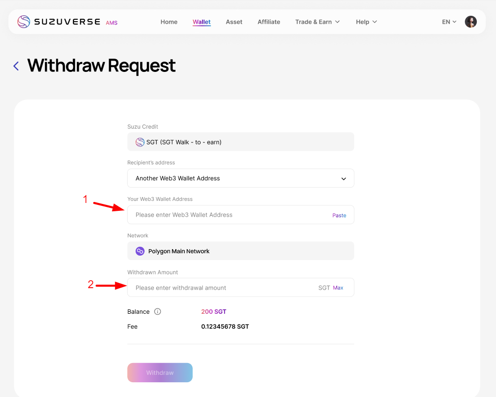 [1] SGT를 받을 외부 지갑 주소를 입력하세요. Polygon 네트워크에 있는지 확인하세요.