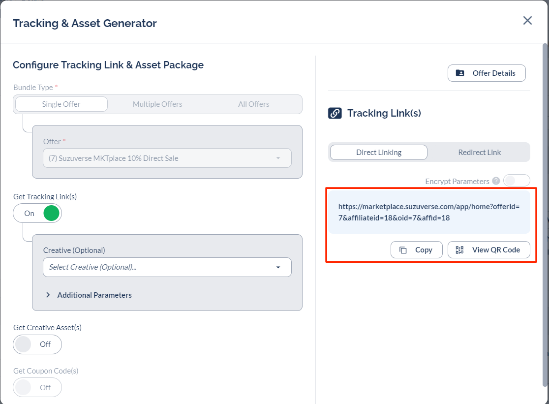 4. A nova janela denominada Tracking & Asset Generator será exibida e, em seguida, você verá seus links de indicação. Você pode escolher Copiar ou Exibir código QR para compartilhar seu link de indicação