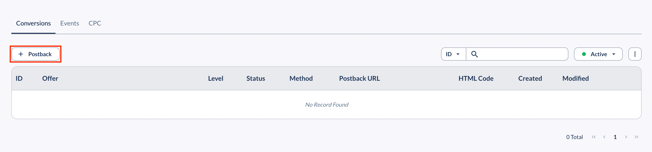 Etapa 1: Navegue até Postbacks e clique no botão [+ Postback].