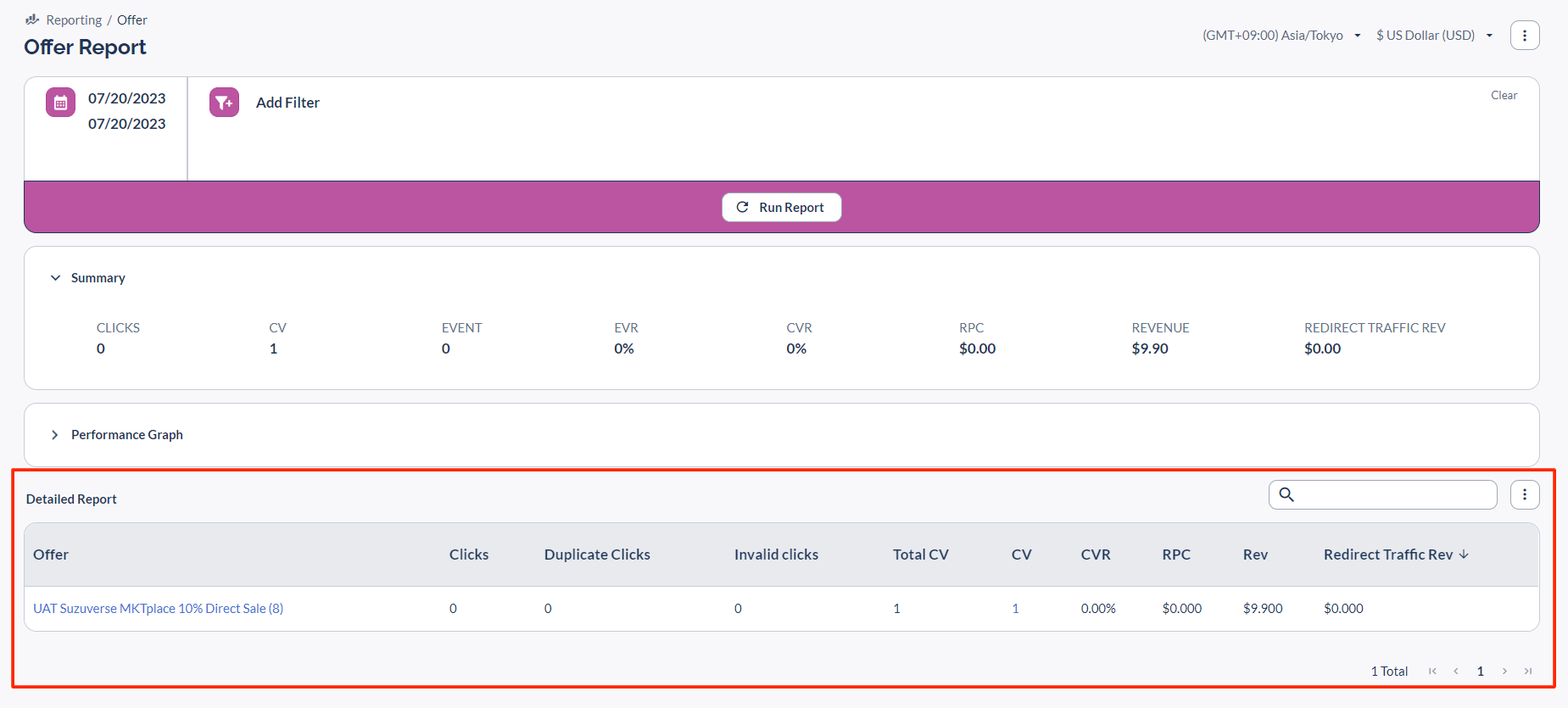 Etapa 3: O relatório do parceiro SUZUVERSE no Everflow é exibido