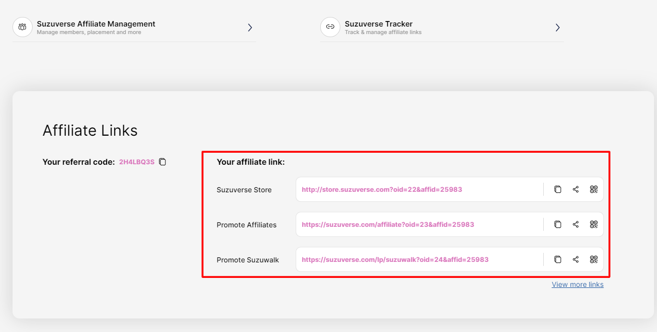 Liên kết liên kết của bạn bao gồm ID của bạn, bằng cách đó bạn có thể theo dõi mọi khách hàng mới mà bạn giới thiệu. Khi quảng cáo Liên kết Suzuverse, hãy luôn sử dụng đường link liên kết này của bạn để đảm bảo bạn nhận được tín dụng cho khách hàng mới mà bạn mang đến Suzuverse và được tính chuyển đổi 1 lần nhấp qua liên kết này